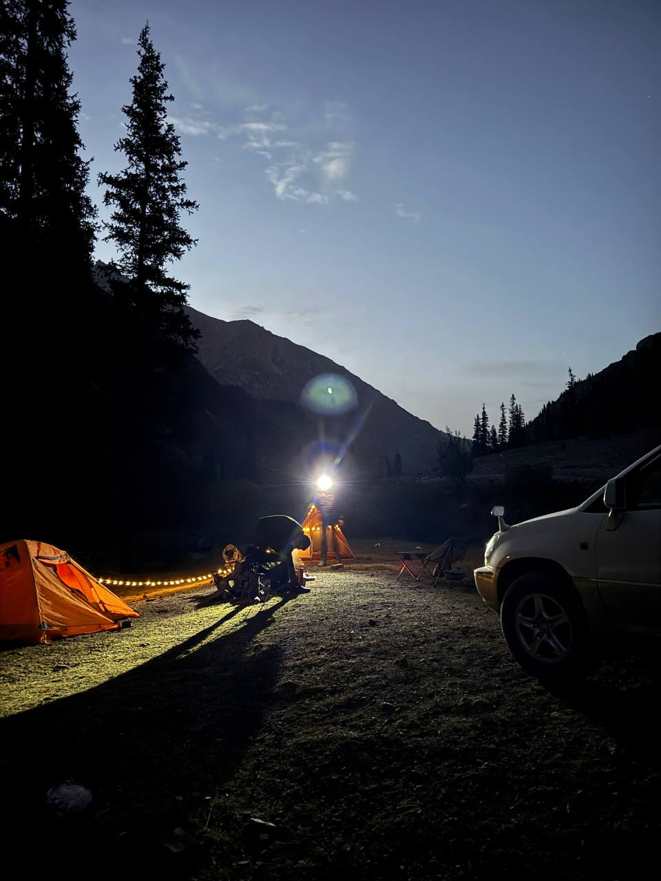 После озёр шуруем в лагерь. После кемпинга на мысу (координаты: N42.318710 E78.549037, тут можно разжиться платным интернетом через Старлинк) приходится уже включать фонарики. Тем временем тучи опять начинают закрывать небо и мелькают отдалённые всполохи молний. По дороге встречаются мрачные лица групп, которые только дошли. Непонятно: поздно вышли, или просто не были готовы к такому пути. Все шли в сторону кемпинга.