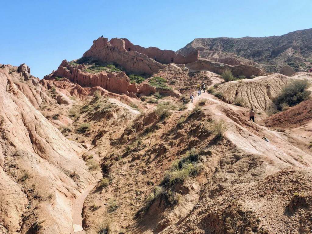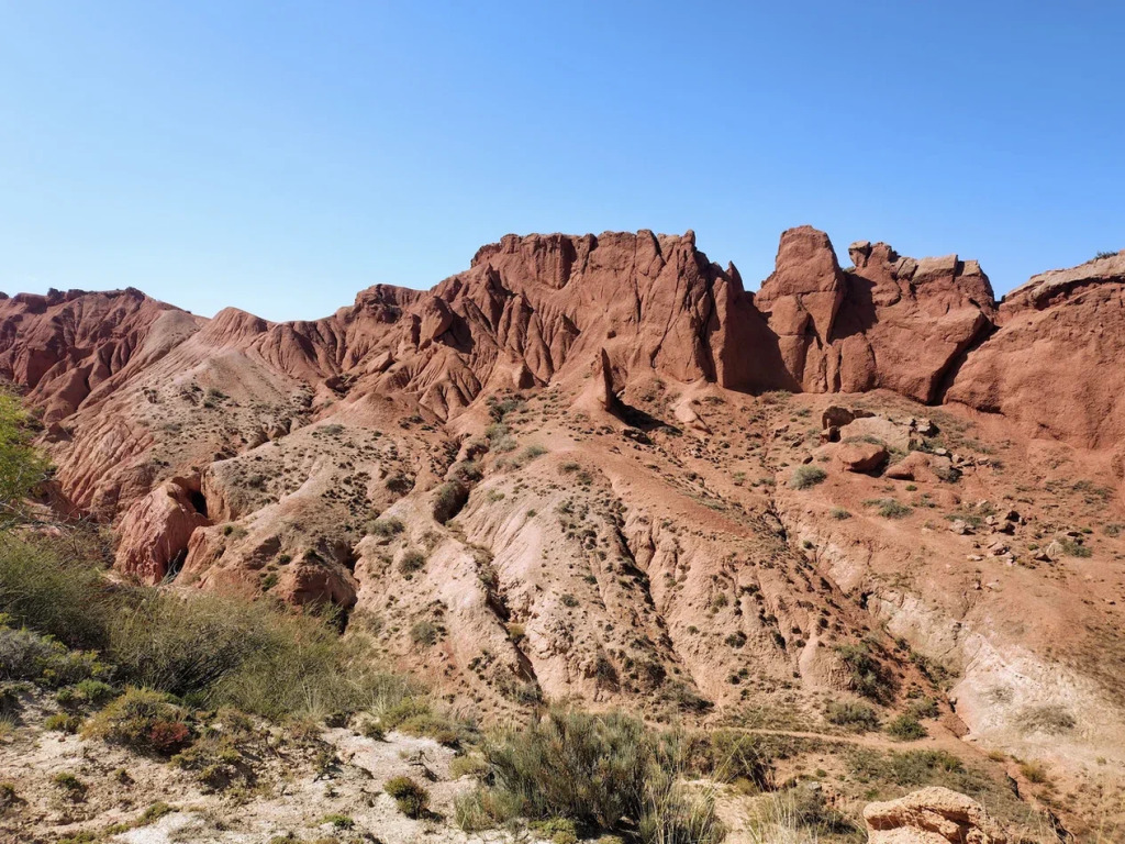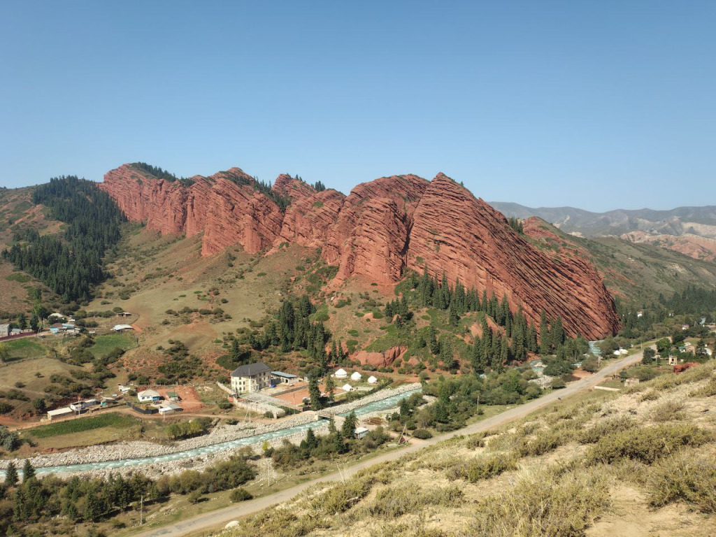 На утро 7 сентября договариваемся с хозяином на завтрак в 7:30. После чего собираемся и стартуем в Лесное. Там ставим машину за 250 сом/сутки (хозяин требует плату вперёд). Сам же хозяин на древнем фольцвагене за 2000 сом соглашается довезти нас до Джеты-Огуз. Там поднимаемся на дежурную видовую, делаем фото красных скал, 7 быков и разбитое сердце: