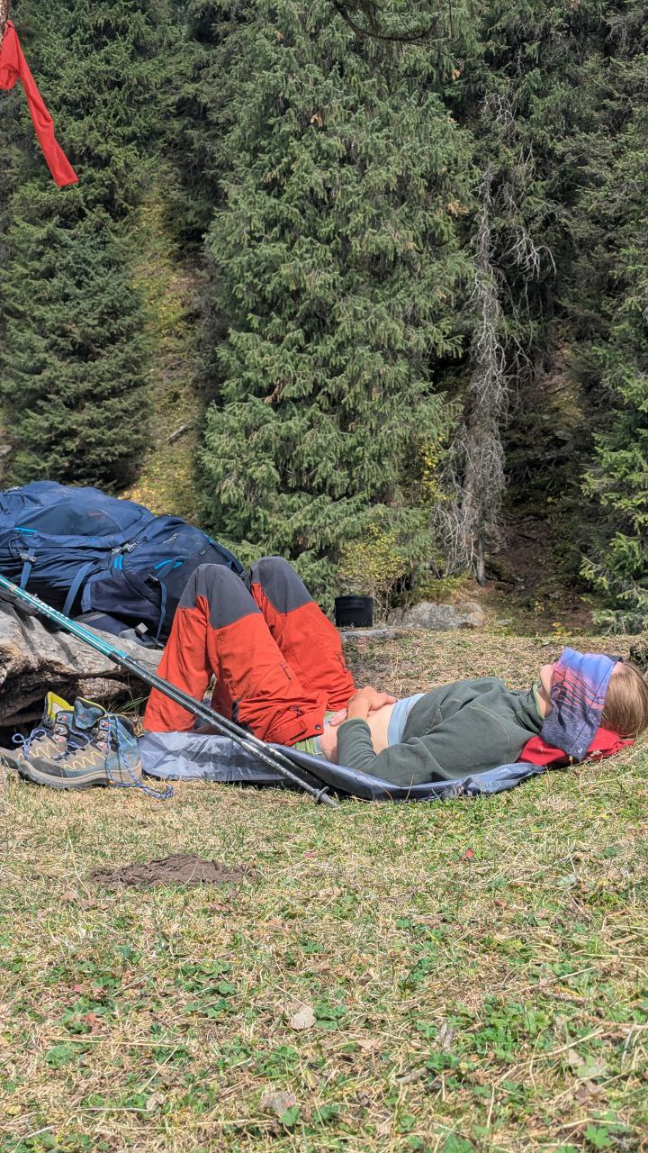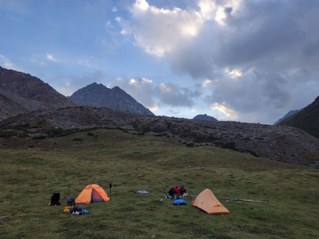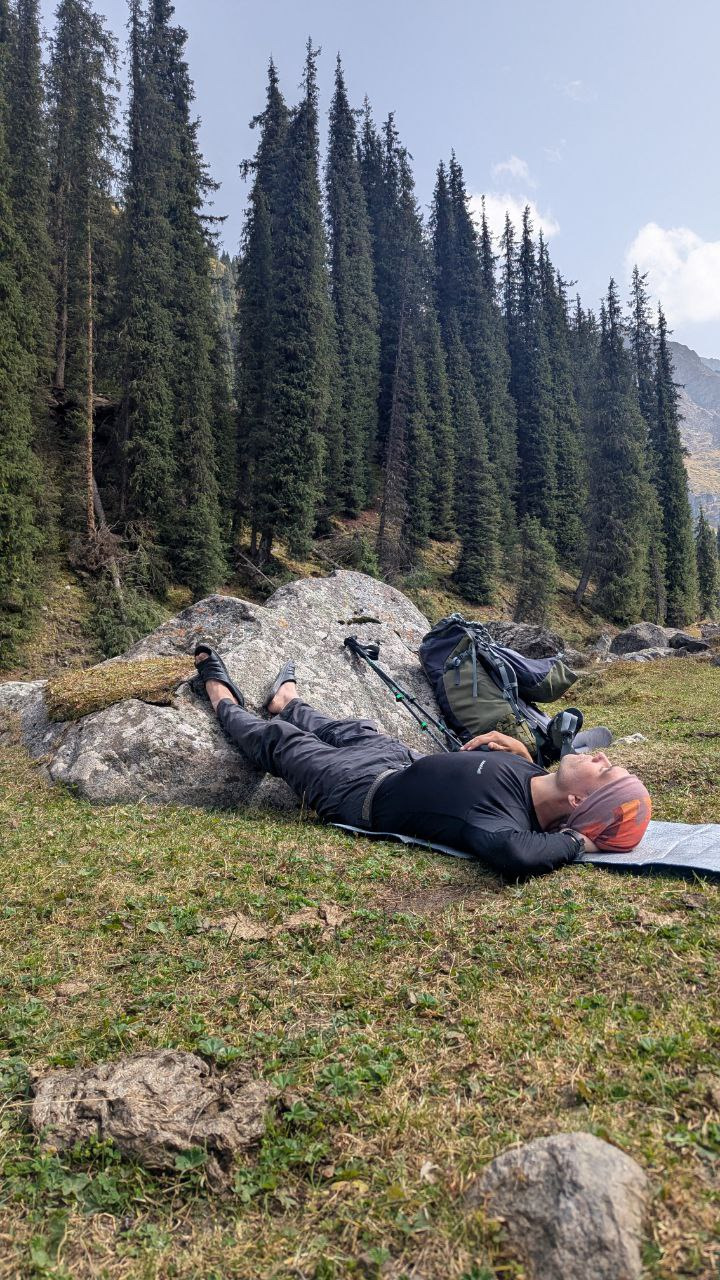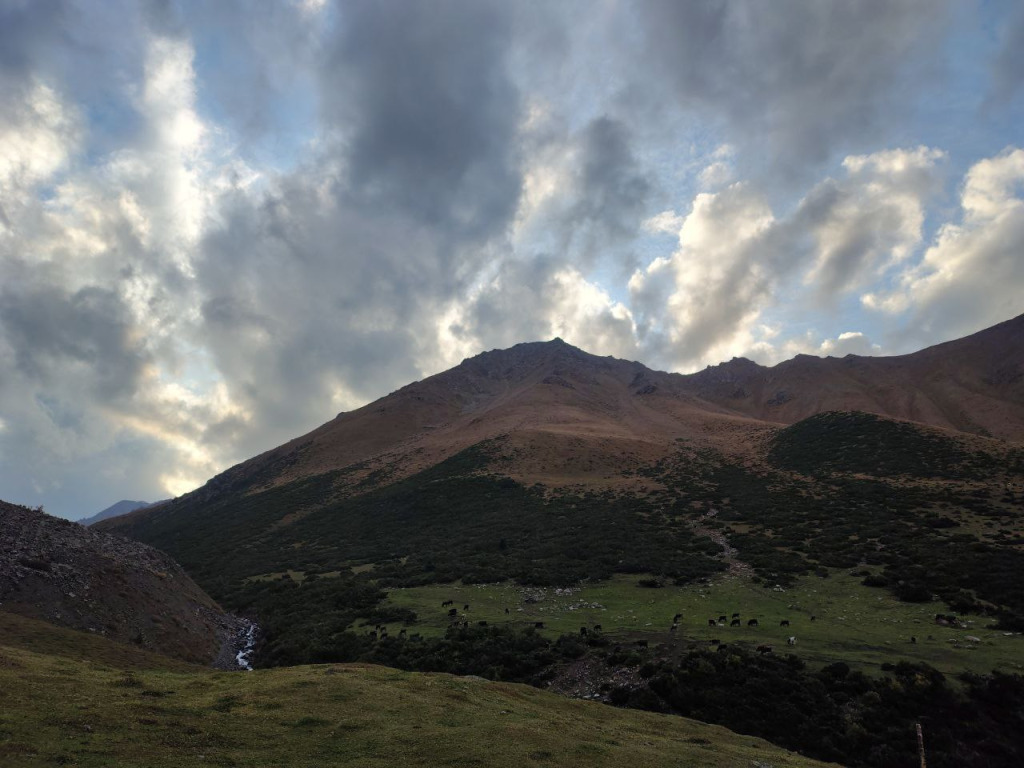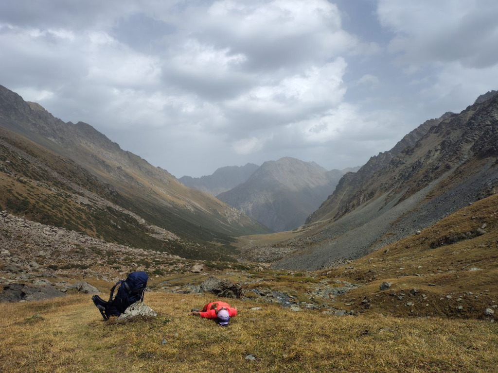Обед у нас затянулся. Пока обедали, регулярно подрывались шугать коров от наших вещей. В это же время спустилась с перевала пара из Испании. И сразу разбили лагерь. Как оказалось, они планировали идти на Ала-Кёль через перевал Панорамный, хотя для неподготовленных туристов тропа помечена как “not for hikking”. Даша подсказала им это, что бы не страдали лишний раз.