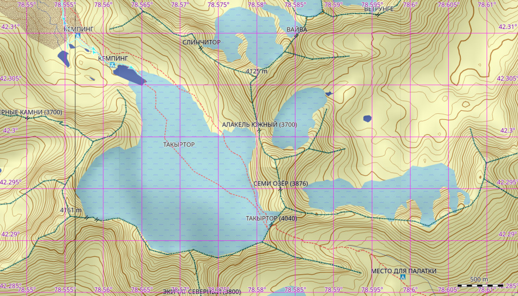 - День 3-9. Оставляем машину на платной стоянке в Каракол и на такси до курорта Джеты-Огуз (но тут всё скорректировалось на месте). Пешеходная часть по нитке: курорт Джети-Огуз (радиальное посещение видовой площадки) — р. Джети-Огуз — р. Телеты зап. - перевал Телеты (1А, 3800 м) — р. Телеты — р. Уюнтор — р. Каракол — альплагерь Каракол — стоянка Сирота — р. Кургак-Тор — оз. Ала-Кёль — перевал Панорамный (1А, 3770 м, радиально) — перевал Ала-кёль Северный (1А, 3900 м) — р. Кельдеке — р. Арашан — стоянка Алтын-Арашан. Термальные источники. Выброска в Каракол. Рассматривался вариант пешего выхода со стоянки Алтын-Арашан до Теплоключенки. Ночёвка в живописной долине реки Тургенаксу, недалеко от метеостанции недалеко от перевала Чон-Ашу. Опционально и по возможности сходить пик 30 лет ВЛКСМ. Перевал Телеты: 1А, высота 3800 м, снежный склон, крутизна склона до 30 градусов. Перевал Алакёль Северный: 1А, высота 3900 м, снежный склон, крутизна северо-восточного склона до 40 градусов. Перевал Панорамный: 1А, высота 3771, скальный.