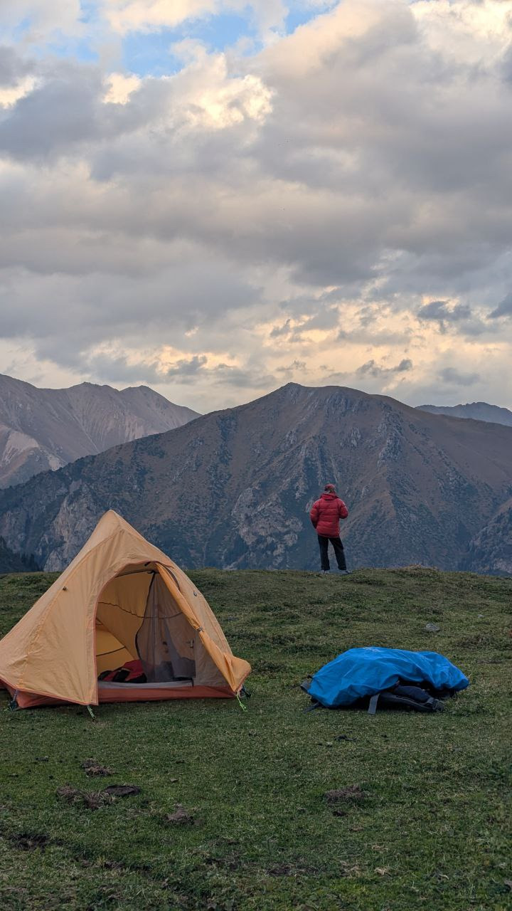 На хижине утиль-сбор рекреационный сбор 150 сом с человека. Можно ночевать на нарах в тепле за 850 сом/чел/ночь. Можно покушать в баре или отведать чего горячительного там же. Цены прикидывайте. Из бонусов: бесплатный WiFi, но на ночь его гасят. Гонят его через ретранслятор направленный на одном из пиков, хитро. Мест для палаток много, так что находим подходящее без проблем. Мыши тут шныряют чуть не по ногам, так что стоит быть осторожнее с продуктами.