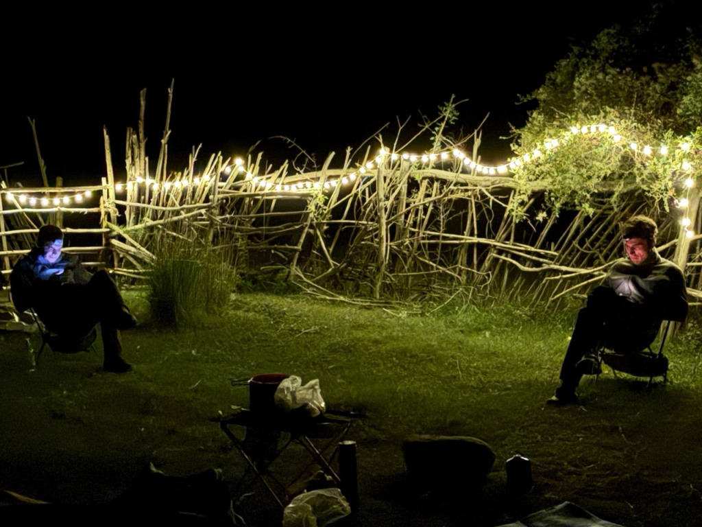 В конце, возле плетёного забора действительно очень удобная полянка. Да ещё тепло! И ветра здесь нет от слова совсем. В общем лагерь получился очень уютным: