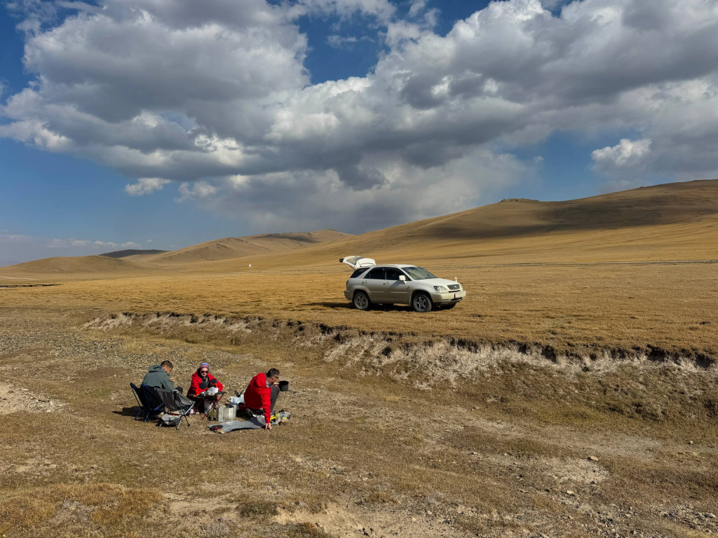 Ветер быстро загоняет нас в машину и выдвигаемся в сторону перевала Молдо-Ашуу. По пути начинаем высматривать место получше, что бы съехать и пообедать на берегу озера.