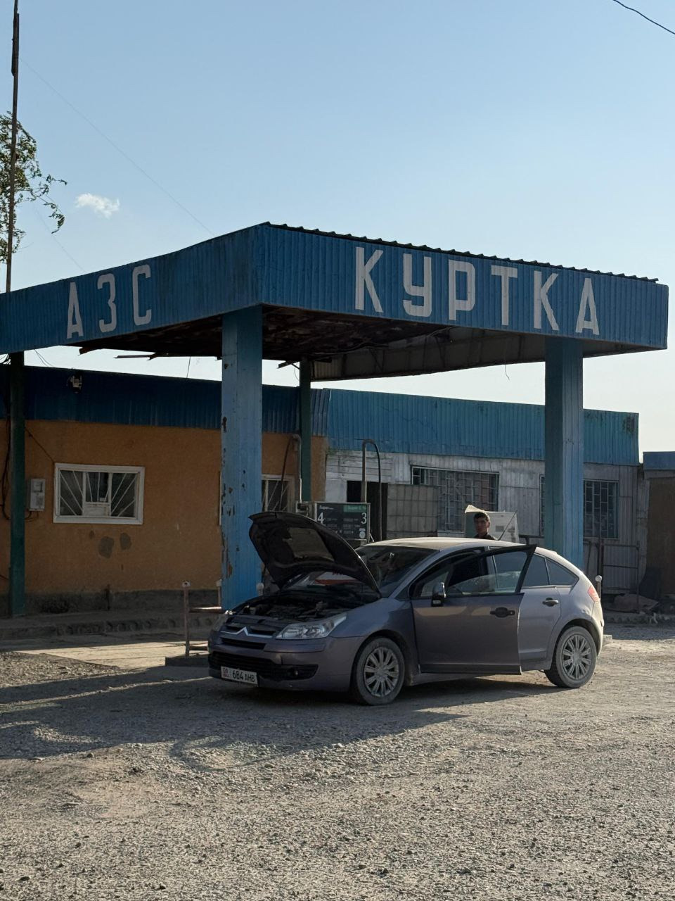 На въезде в Кызыл-Туу у колонки пытаемся набрать воды, но терпим фиаско. Как позже узнали: колонки отменили, остались только неработающая фурнитура. Видим местного, моющего машину, он с радостью разрешил нам набрать воды да ещё угостил вкуснейшими яблоками.